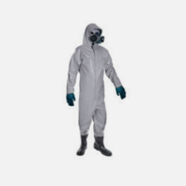 Macacão de segurança confeccionado em tecido de poliéster resinado com policloreto de vinila, proteção abaixo da axila, reforço sanfonado no cavalo da calça, bota e luva de pvc integrada (solada eletrônicamente) e com fechamento em botão de pressão e velcro.